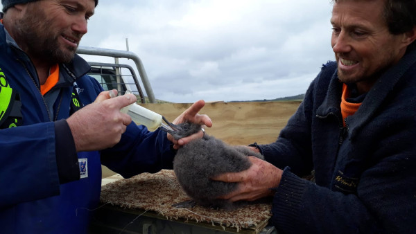 Mike Bell and Dave Bell feeding translocated tītī chick - image by Kathryn Richards