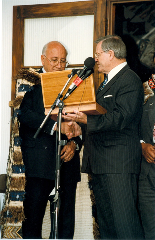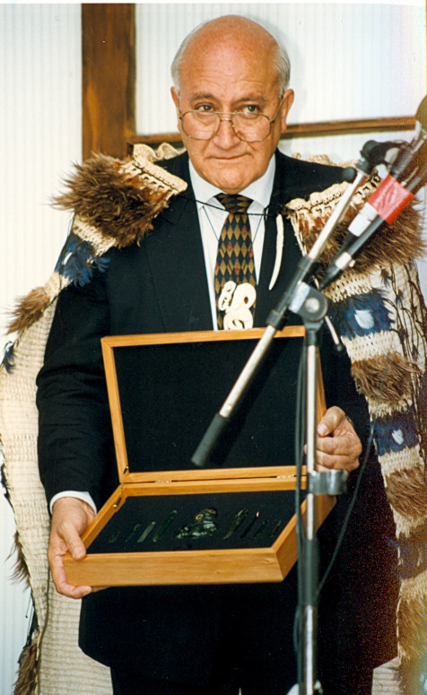 Tā Tipene accepted the pounamu on behalf of Kāi Tahu whānui from then Prime Minister Jim Bolger at the signing of the Ngai Tahu Deed of Settlement.