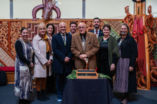 Representatives of Te Kupeka Tiaki Taoka Southern Regional Collections Trust, Southland Museum and Art Gallery Niho o te Taniwha, and Invercargill City Council accompanied the pounamu onto Te Rau Aroha Marae where it was received during a pōwhiri on behalf of Te Runanga o Ngāi Tahu by Tā Tipene and Kaiwhakahaere Justin Tipa.