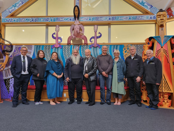 At Te Rau Aroha Marae, from left: Dean Whaanga, Ulva Goodwillie, Estelle Pērā-Leask, Stewart Bull, Michael Skerrett, Riki Everest, Gail Thompson, Tāne Davis, Gary Neave.