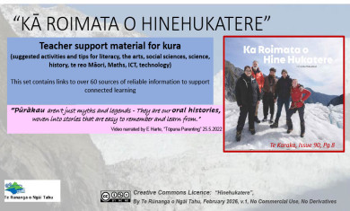 Kā Huru Manu - Ngāi Tahu Cultural Mapping Project contains information on over 1,000 place names, and it's associated support material, being the 'Kā Huru Manu Education Framework', a teacher resource aimed to support ākonga in Years 7-10.